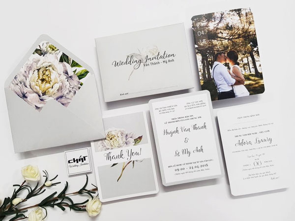 Trong tình yêu, Peony mang ý nghĩa “ hạnh phúc bền lâu” và điều đó lại càng ý nghĩa hơn cho đôi uyên ương trong ngày cưới. Bộ thiệp là sự hòa quyện giữa họa tiết và tông màu xám tây trầm kết hợp với việc sử dụng chất liệu giấy mỹ thuật cao cấp đạt chuẩn FSC thân thiện với môi trường. Đây là mẫu thiệp cưới được yêu thích nhất của Chất.